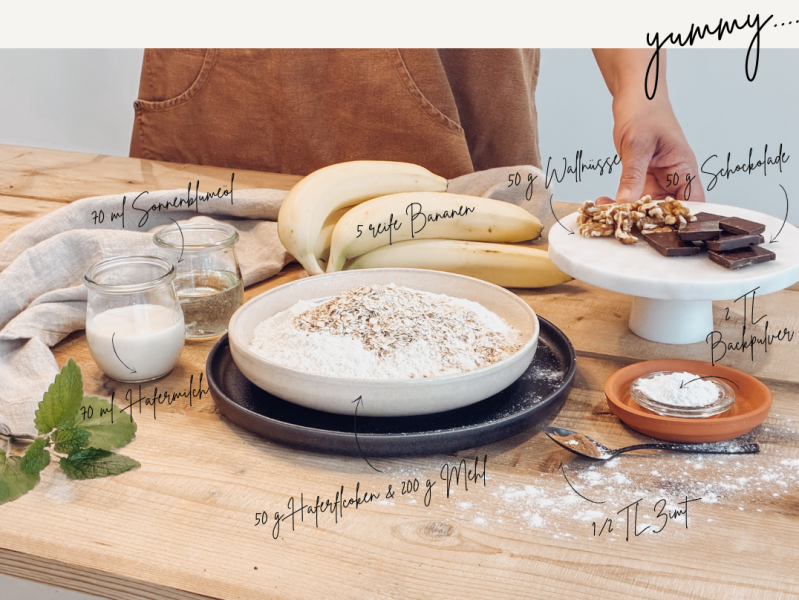 Alle Zutaten – bis auf die extra Banane für die Deko – in eine große Schüssel geben. Die Bananen vorher gut zerdrücken, dann alles mit einem Löffel oder Handrührgerät verrühren, bis ein glatter Teig entsteht. Schokostückchen und Nüsse kannst du jetzt unterheben. -