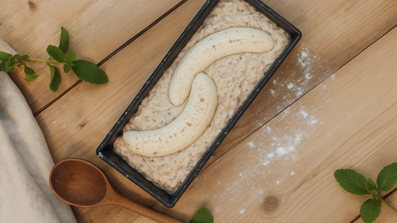Für ca. 50–60 Minuten backen. Mit einem Holzstäbchen testen – bleibt nichts mehr kleben, ist das Bananenbrot fertig.